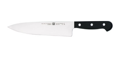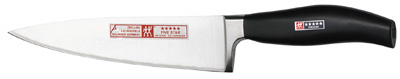 Would you be interested in some background information about the Zwilling J A Henckels Knife company, and the innovative features their kitchen knives offer that can help make your cooking easier? These superb knives were first manufactured in the cutlery capital of the world – Solingen, Germany, in 1731. Thanks to 270 years of innovative craftsmanship, the Zwilling J A Henckels knife has a distinguished reputation, and won awards of excellence in the World’s Fairs of 1851, 1893 and 1915. In 1939, the Zwilling J A Henckels knife company received a patent for the innovative Friodur® ice-hardening process. With this process their knife blades, made of a special steel formula, are quenched to below freezing temperatures during the heat treating process, resulting in superior blades. In 1992, the Zwilling J A Henckels knife company introduced Sintermetal Technology. With this technology, while the blade, bolster, and tang sections of the knife are made of different alloys, the sections are fused together into one solid piece, which allows them to work in perfect balance with one another. Thanks to unique, premium craftsmanship, many Chefs consider Zwilling J A Henckels kitchen knives indispensable, And to make chefs on any budget happy, a number of different Zwilling J A Henckels knife lines are available at different price ranges. Zwilling J A Henckels TWIN Kitchen Knives The TWIN Grip, TWIN Gourmet, and TWIN Pollux knives are affordable knives with the company's Friodur® treated stainless blades, no bolsters, and they're carefully sharpened with a laser monitored process. TWIN Grip handles are designed for comfort. TWIN Gourmet handles are classically shaped, with rivets, and dishwasher safe.
